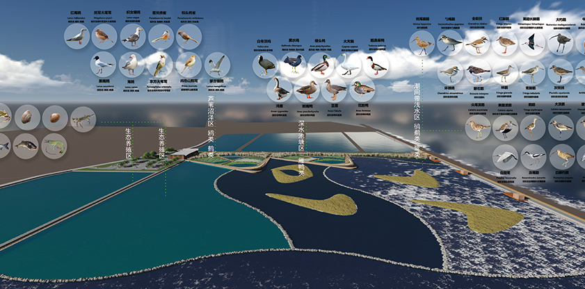 LOVE棲息地在潮間淺水區(qū)和深水區(qū)設(shè)計(jì)人工島棲息地,即水鳥高潮棲息地,棲息地通過不同水生池塘分為候鳥區(qū)和流鳥區(qū),可容納恒魚類、鴨類、鷺類水鳥,保證全天候的觀鳥體驗(yàn)。