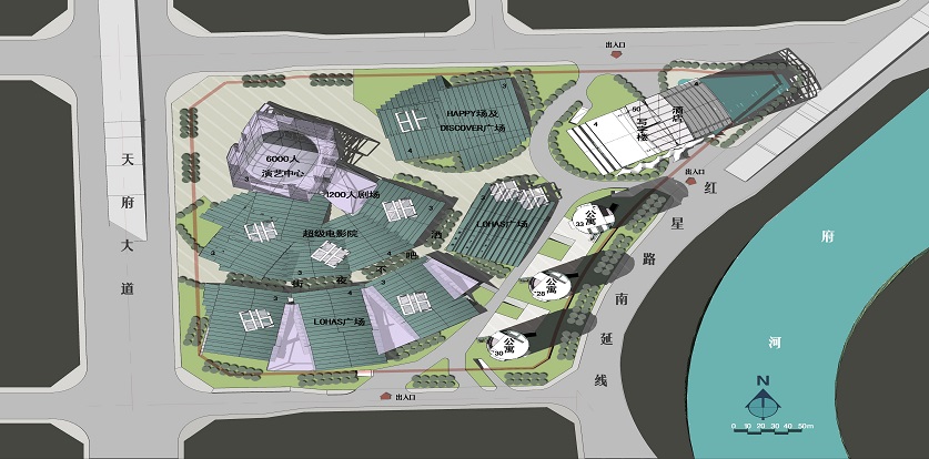 根據周邊交通及自然條件,基地具有西側交通便利、東側擁有可利用自然資源的特征。沿天府大道一側布置人流密集、需要便捷交通的大型演藝中心及劇場,使之成為有活力、富于特色的標志性城市建筑。而將超星級酒店、寫字樓及公寓沿河布置,充分利用府河水資源,同時也提升了沿河的城市景觀形象。通過基地中心地帶的娛樂和酒吧不夜街區,將兩者有機的組合為一個完整的城市文化娛樂綜合體。