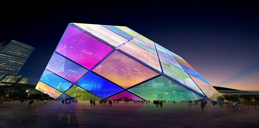 為了使魔方體在夜晚產生奇幻的視覺效果,演藝廳橢圓穹頂及魔方體玻璃外殼上設計了一套完整的LED夜景照明系統。